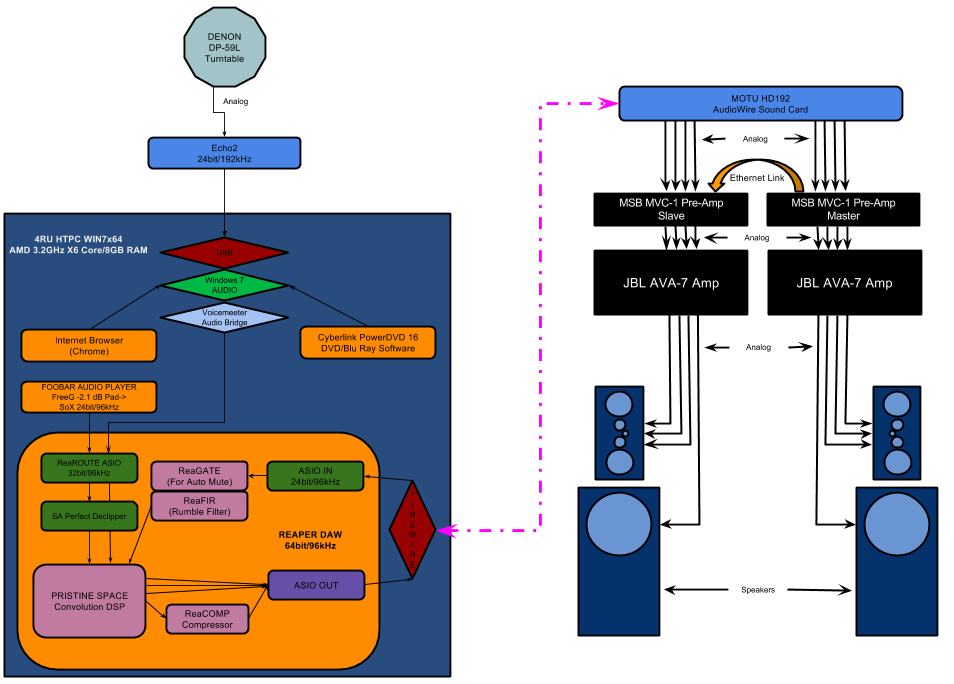 With an active crossover in my audio system now I could really get all aspects of the crossover just right. After progressing from analog active, to a dedicated hardware DSP crossover, I ran across Allocator by Thuneau. This is a VST crossover that has standard filters that can stacked to achieve up to 42dB/oct slopes, along with EQ and delay functions. Using Allocator was simple and fun. I measured each driver in my speakers, then created targets using LEAP CrossoverShop. After the targets were created I tweaked Allocator to fit the targets as best as I could. When the targets were dialed in I adjusted the delay of each driver for the best time alignment. Presto, a great crossover was realized. Now what the heck is that giant block diagram below? -The next evolution in my stereo.