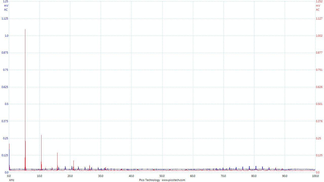 iFI iPhono PSU (Red) vs Boss PSU (Blue) Spectrum, 100kHz Bandwidth Limited