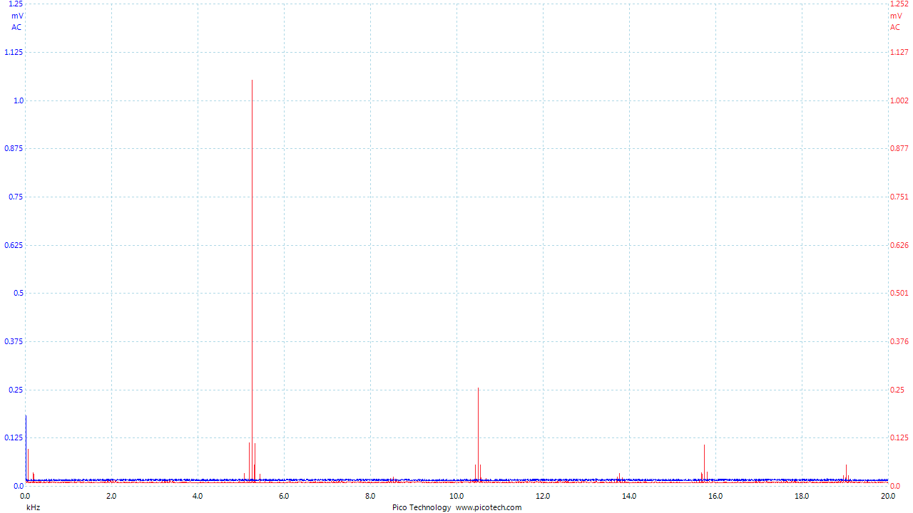 iFI iPhono PSU (Red) vs Boss PSU (Blue) Spectrum, 20kHz Bandwidth Limited