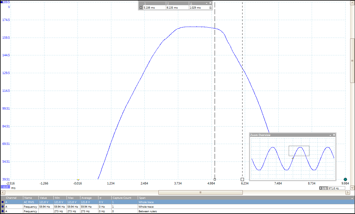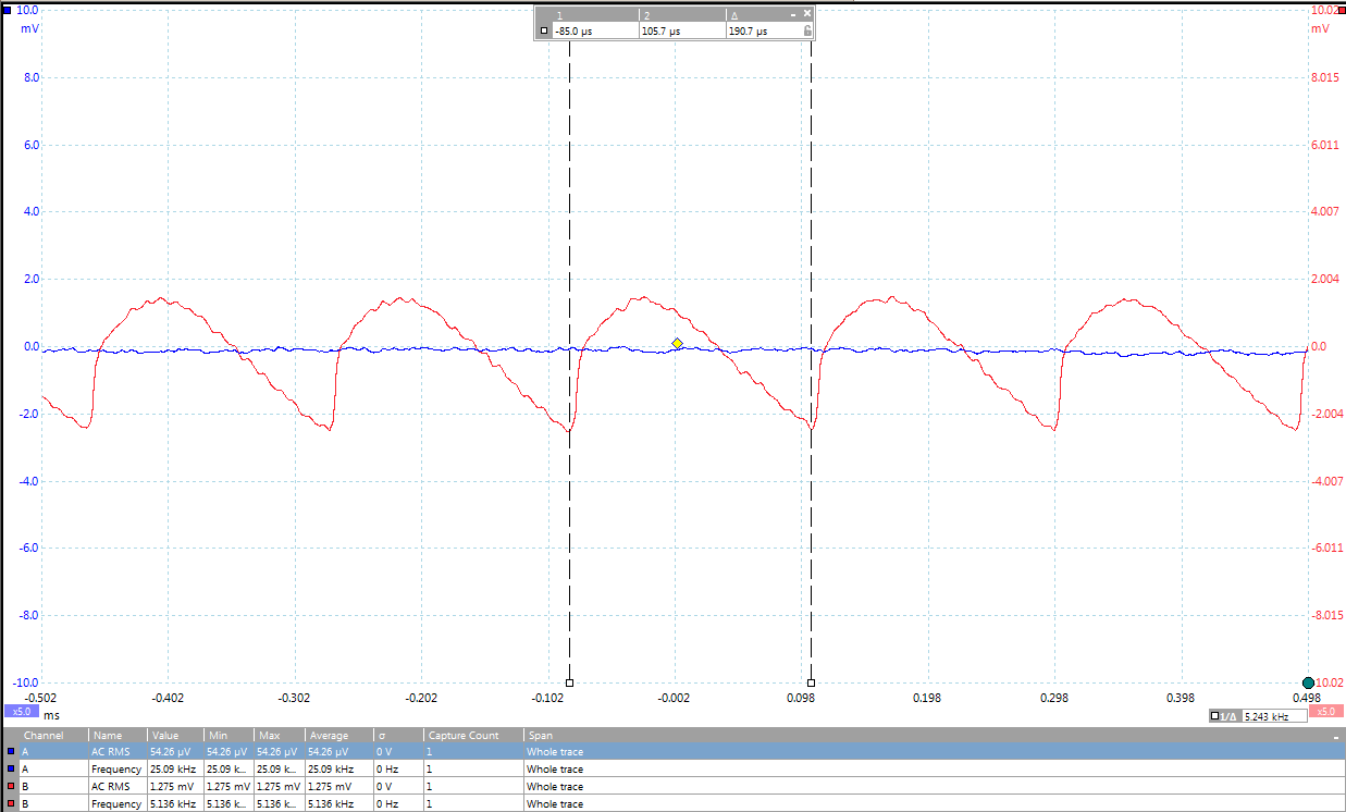 iFI iPhono PSU (Red) vs Boss PSU (Blue) Waveform, 100kHz Bandwidth Limited